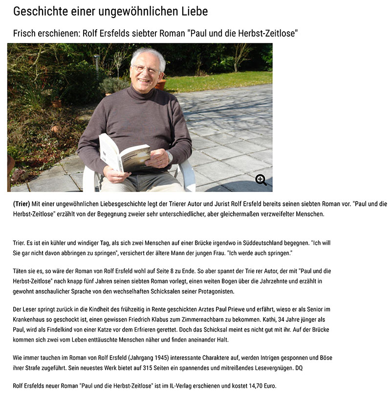 Nach dem Abitur studierte der gebürtige Trierer an der Verwaltungs- und Wirtschaftsakademie in Trier und machte berufsbegleitend eine Ausbildung an der Industrie- und Handelskammer (IHK). 30 Jahre lang war er Geschäftsführer der IHK und im Bereich Wirtschaftsrecht tätig bevor er 2010 in Rente ging. Kurzgeschichten hat er zwischendurch immer mal wieder geschrieben. Veröffentlich hat er sie nicht. "Die Geschichten waren eher für den privaten Gebrauch", erklärt Ersfeld. Im Rahmen seiner Tätigkeit bei der IHK verfasste er zwar wirtschaftsrechtliche Kommentare und Fachglossen, Zeit für literarisches Schaffen blieb dem Vater zweier Kinder jedoch wenig. Das kam erst mit seiner Pensionierung. "Ich habe mir ein paar Monate vorher überlegt, was ich machen kann, wenn es soweit ist. Mich nur mit dem Garten beschäftigen, dazu hatte ich keine Lust. Da ich gerne schreibe, kam die Idee einen Roman zu verfassen."